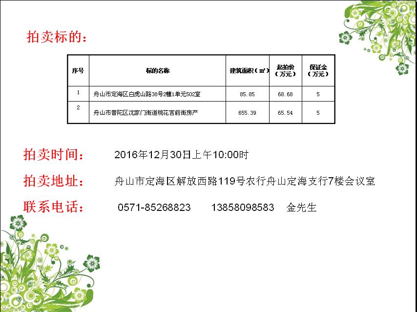 農(nóng)行舟山分行閑置房產(chǎn)拍賣