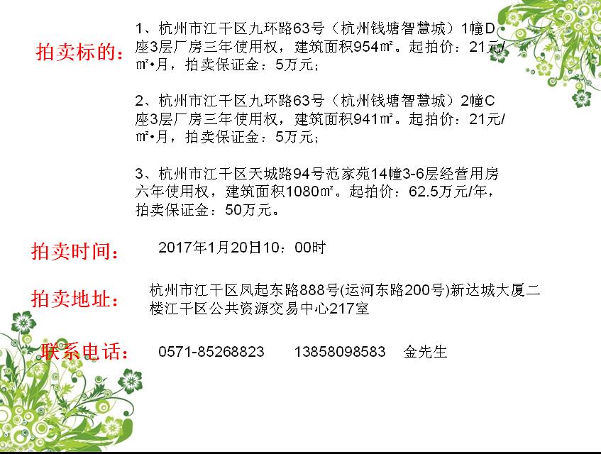 杭州錢塘智慧城標準廠房、范家苑經營用房使用權轉讓拍賣