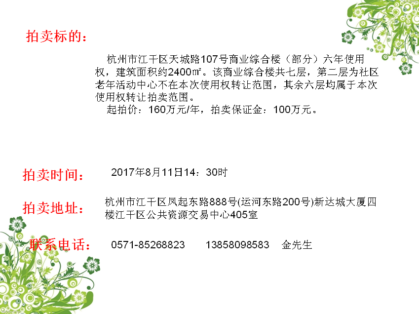江干區天城路107號商業綜合樓(部分)使用權轉讓拍賣