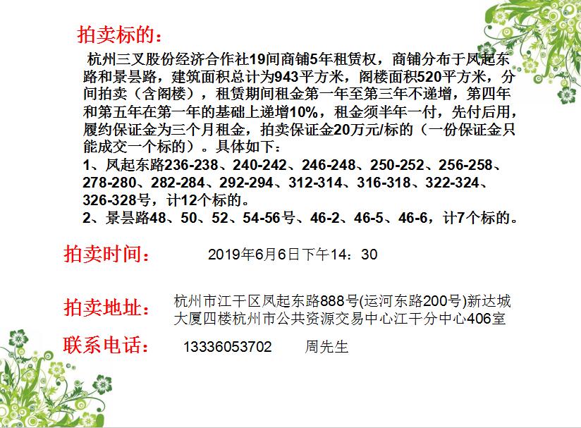 杭州市鳳起東路、景曇路19間商鋪 5年使用權轉讓