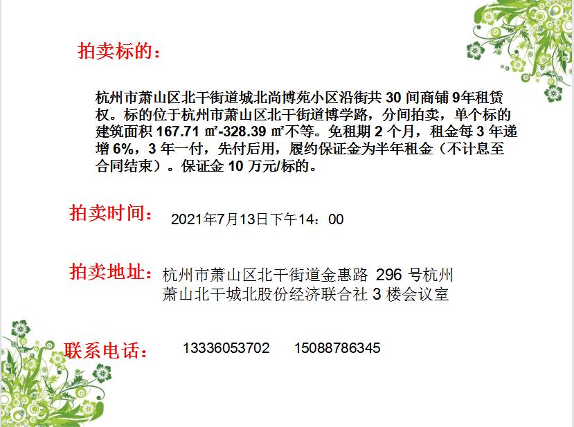 拍賣會(huì)場(chǎng)地址:蕭山區(qū)北干街道金惠路296號(hào)蕭山北干城北股份經(jīng)濟(jì)聯(lián)合社3樓會(huì)議室